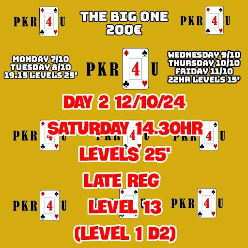 Nous débutons notre festival THE BIG ONE 80€ ce lundi. Vous aurez la possibilité de vous qualifier via 5 jours 1 du lundi au vendredi, 2 fois avec des niveaux de 25 minutes et 3 fois avec des niveaux de 15 minutes.